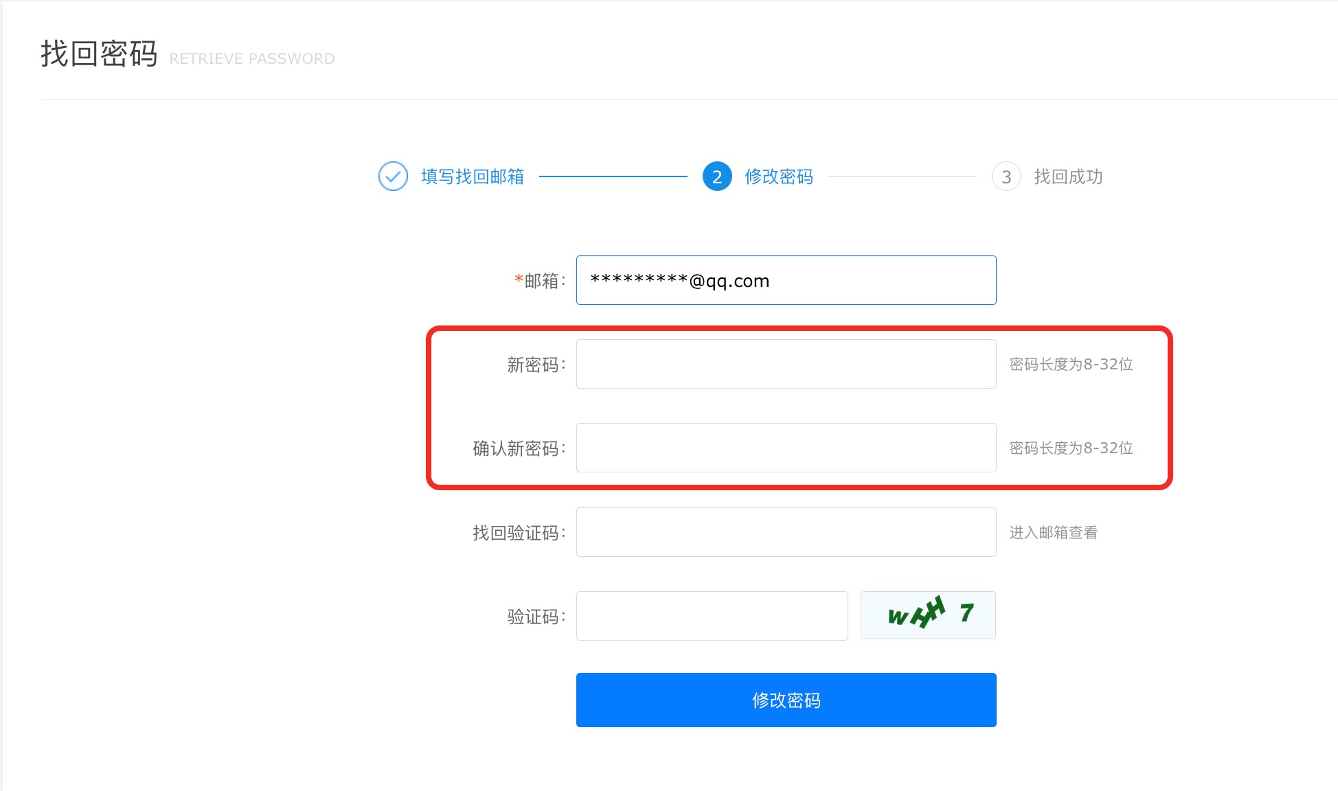 輸入新密碼,以及填入郵箱里的找回驗證碼。