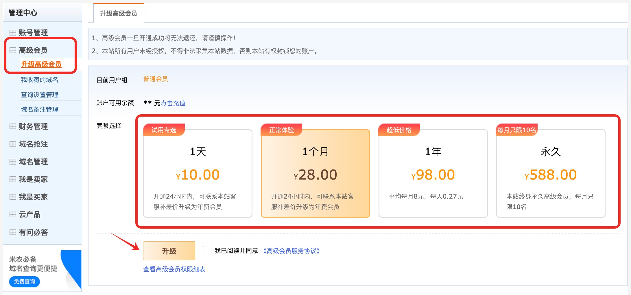1. 高級會員一旦開通成功將無法退還,請謹(jǐn)慎操作!