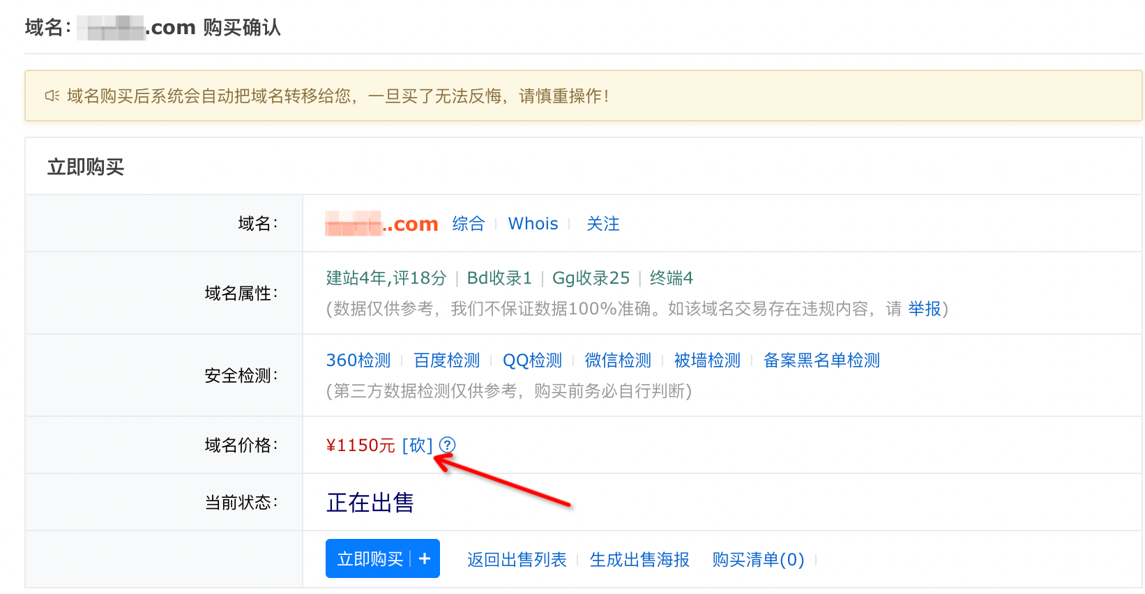 1、在一口價(jià)頁面,點(diǎn)擊您心儀的域名進(jìn)入購買確認(rèn)頁面,域名價(jià)格后面有一個(gè)【砍】按鈕。