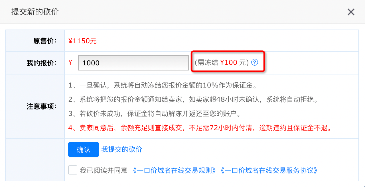 答: 保證金 = 您輸入的砍價(jià)金額 × 10%。例如,您對1000元的域名砍價(jià)到800元,則需要凍結(jié)80元作為保證金。
