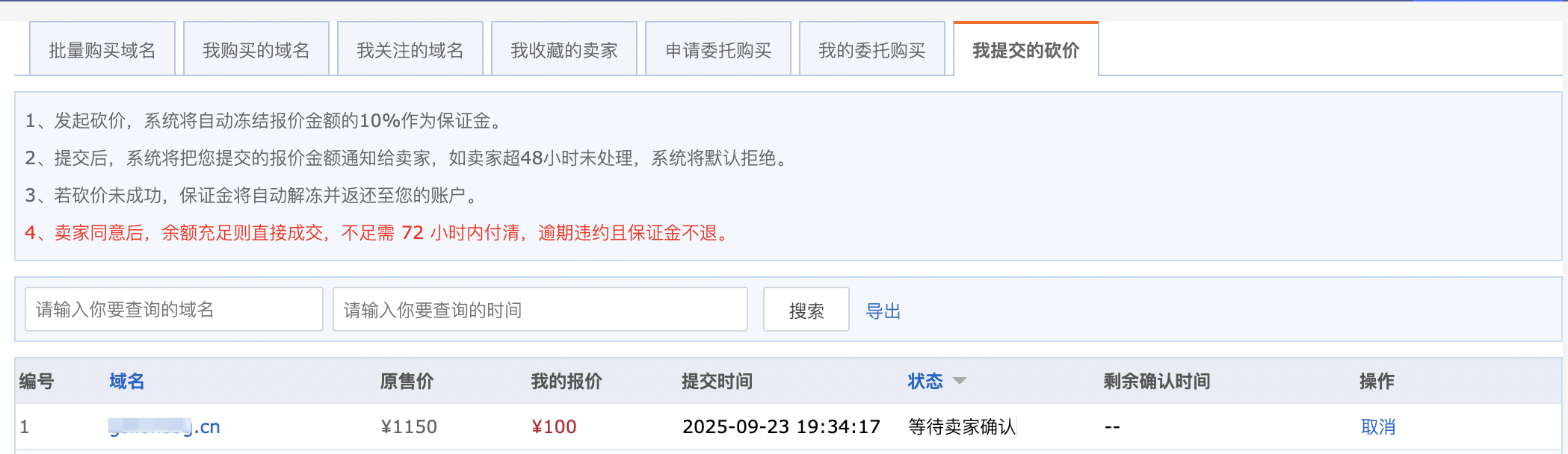 3、接下來,您就可以在“我是買家-我提交的砍價(jià)”中關(guān)注賣家回應(yīng),您的砍價(jià)申請將通過站內(nèi)信通知賣家。賣家有48小時(shí)的時(shí)間來處理您的申請,在賣家確認(rèn)同意之前,您也可以選擇取消砍價(jià)。若賣家同意了您的砍價(jià),系統(tǒng)自動檢查余額,余額充足則直接成交;若余額不足,需72小時(shí)內(nèi)補(bǔ)足余款并完成支付。