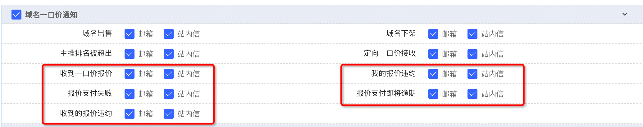 無論您是買家還是賣家用戶,您都可以在賬號管理-通知設(shè)置-域名一口價(jià)通知中,設(shè)置您需要的站內(nèi)信和郵箱提醒。