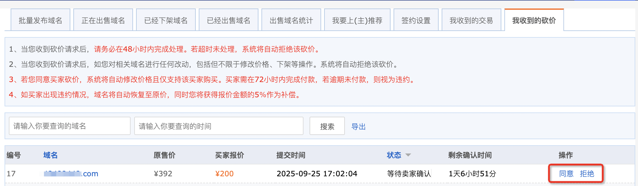 2、如有用戶對您發(fā)布的域名發(fā)起了砍價(jià)申請,您將收到站內(nèi)信提醒,同時(shí)需要您至“我是賣家-我收到的砍價(jià)”中進(jìn)行操作,請您務(wù)必在48小時(shí)內(nèi)完成處理,若超時(shí)未處理,系統(tǒng)將自動默認(rèn)拒絕該砍價(jià)。更多注意事項(xiàng)請您仔細(xì)閱讀頁面提示。