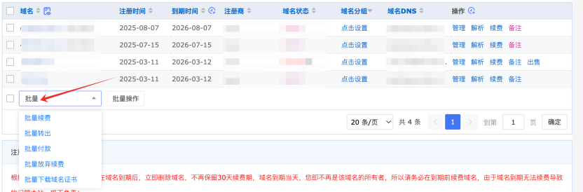【域名管理】-【我的域名】頁(yè)面中【批量操作】輸入框現(xiàn)支持直接輸入內(nèi)容模糊匹配,提升批量管理效率。