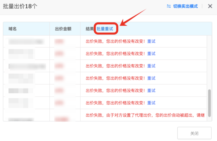 【我參與的競(jìng)價(jià)】頁(yè)面批量操作出價(jià)時(shí),若部分域名出價(jià)失敗,現(xiàn)已新增【批量重試】按鈕,可一鍵重新出價(jià),操作更便捷。