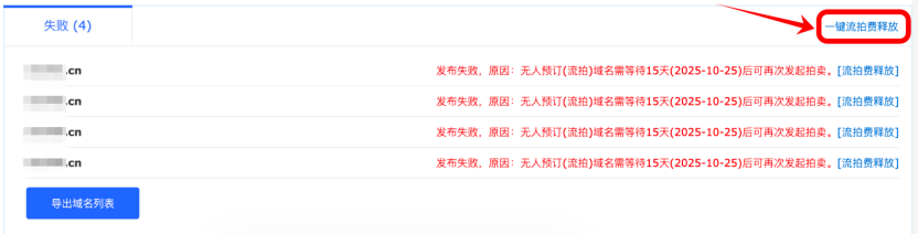 無人預(yù)定的流拍域名現(xiàn)支持批量使用流拍費(fèi)操作,并新增【一鍵流拍費(fèi)釋放】功能,操作更便捷高效。