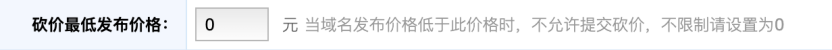 【我是賣家】-【店鋪設(shè)置】現(xiàn)支持設(shè)置“砍價(jià)最低發(fā)布價(jià)格”。當(dāng)域名發(fā)布價(jià)低于該數(shù)值時(shí),將不允許提交砍價(jià);如不限制,請(qǐng)?jiān)O(shè)置為 0。