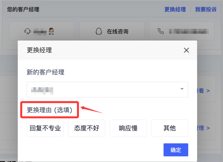 【賬戶管理中心】-【我的賬戶】,更換客戶經(jīng)理可選擇或填寫更換理由,幫助我們更好的了解您的需求,持續(xù)優(yōu)化服務(wù)。